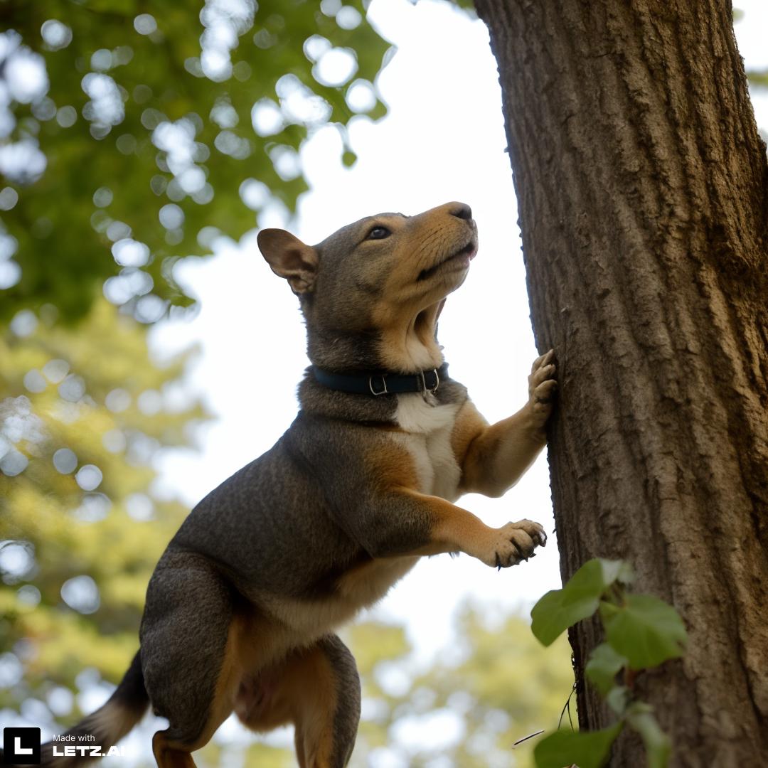 ❌ @mydog jumping and barking around a tree, chasing a squirrel that is sitting on a branch and looking down