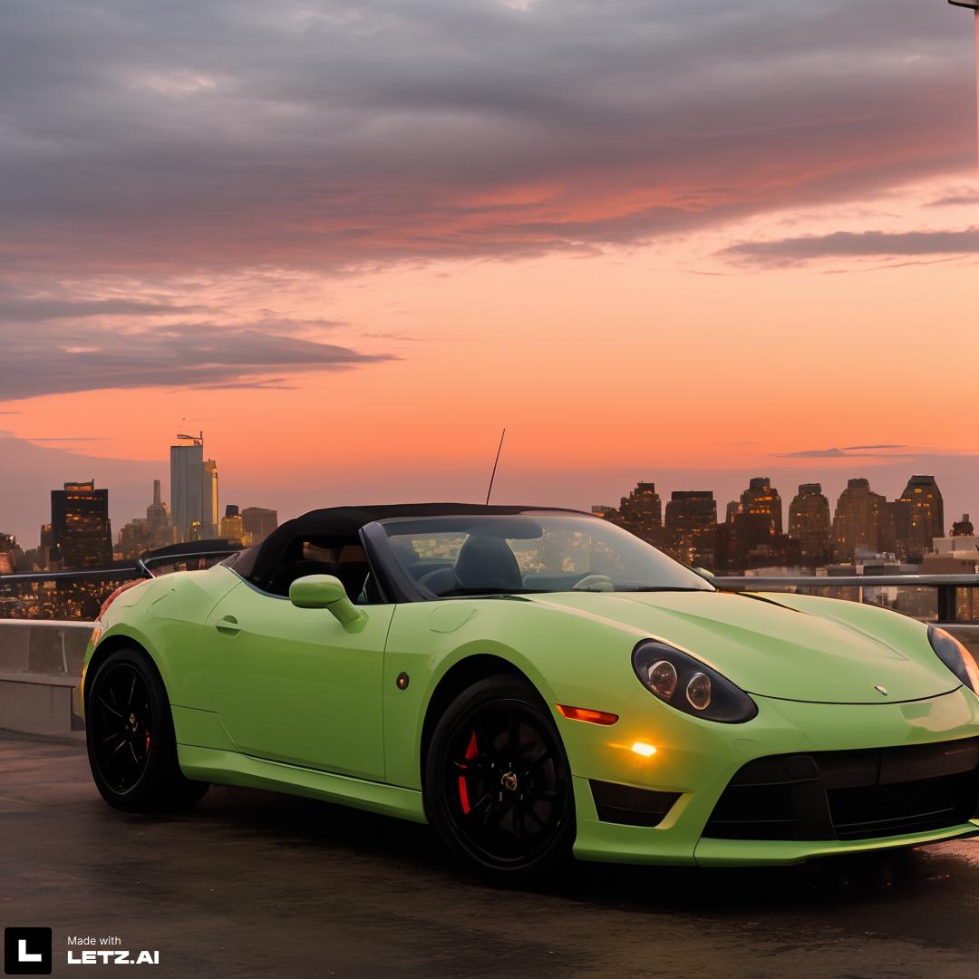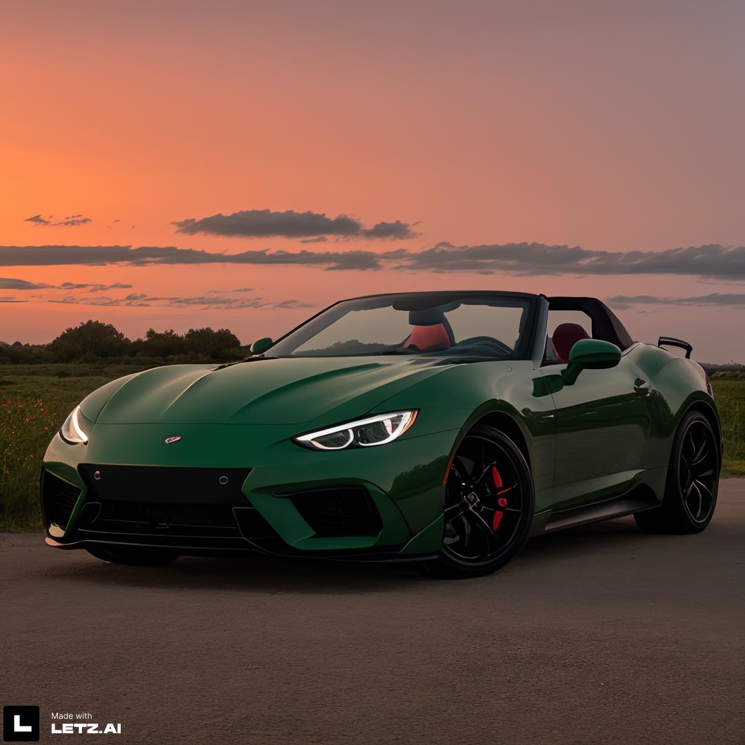 ✅ green sportscar, red sky as background