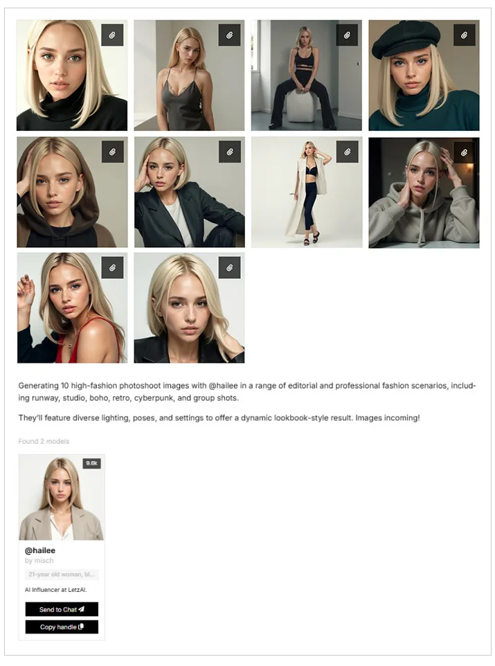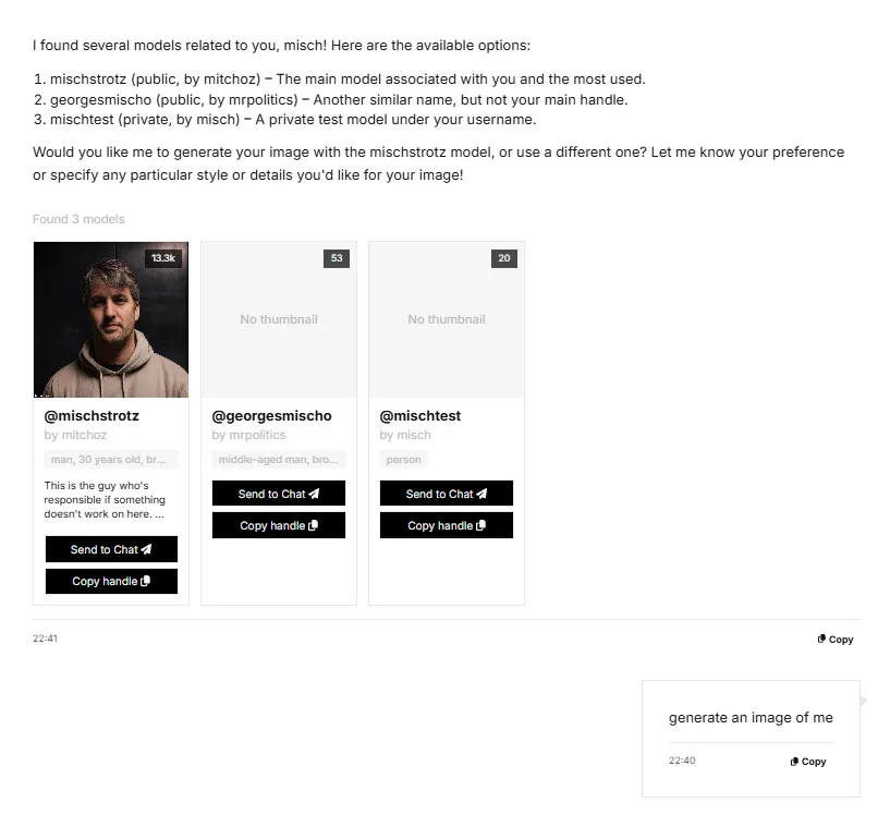 For example, you can now prompt "generate an image of me" or "create 10 photos for my fashion brand starring Misch Strotz" - and LetzAI Chat will search the according model database for you, find related models on the platform, and immediately come up with several prompts for your image generation. Chat can look up people, objects, and styles in our database, based on their name, their types, the creator’s username, and more.