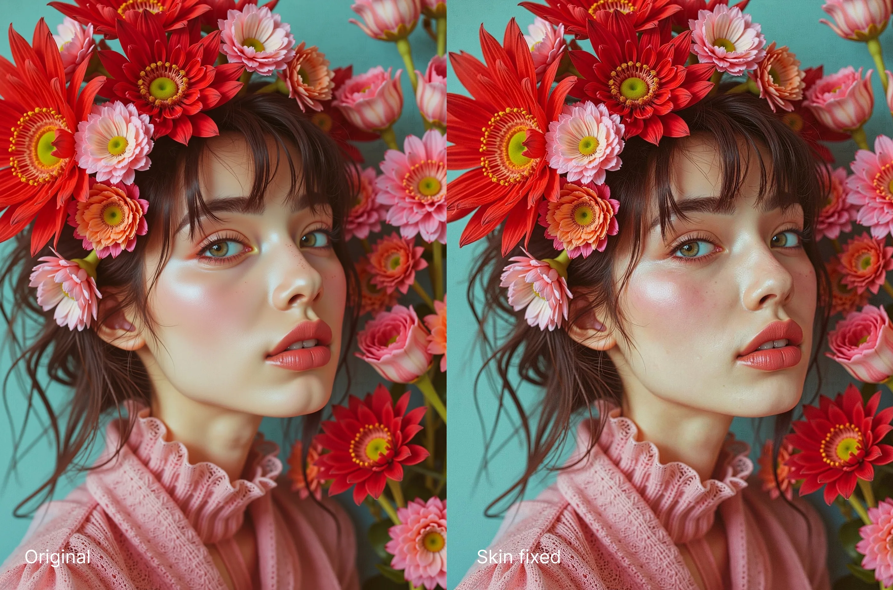 Fix Skin works best on human portraits. It is not designed for non-human characters like animals, and it may produce unwanted results on small faces or non-portrait images.